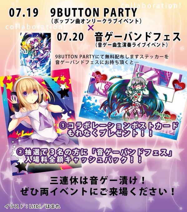 翌日7月20日に開催される音ゲーバンドフェス(http://www.apricotsound.net/fes2014/index.html)様とコラボを実施します! 9BUTTON PARTY#4で無料配布されるステッカーを持って音ゲーバンドフェスに行くと… ①コラボポストカードプレゼント! ②抽選で3名の方に入場料キャッシュバック! 詳細は公式サイト(http://9bparty.com/)の下部をご覧下さい。 無料配布ステッカーとコラボポストカードの9BUTTON PARTY#4側を描かせて頂きました! |