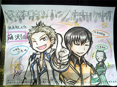 同じサークル名じゃない限り、多分大丈夫なはず…。 まだサークルスペースのチケットが来てないのでどんな感じなのか分からないですが。 コミティア自体も参加は初めてなので、どんな感じなのか気になります。 一般だったら2回位行った事あるんですけどね。 本は無理かもしれないけど、なんかちまっと出せたらいいなぁーとは思ってる。 が、色々と既に予定が入ってしまっていて近辺が忙しい; バレンタイン前日だから、それネタなんか出したいよねー。 去年は無料配布ペーパーでマチ&けーひんのチョコばっきりネタ描きましたな(笑) 突発でイベントに当日参加してきました小田急江ノ島線とJR東海道線と江ノ電の藤沢駅3人。 フリーの落書き用紙に描いてた落書き。 イベント中はパネルに貼られて会場内に飾られてたけど、最終的にはじゃんけん大会の景品となっていきました。 スタッフさんに貰われていったようです(笑) 東海道の頭部がでかい、口元がシャー芯汚れ消えず・・・で悲惨; コピー用紙だから仕方無い・・・。 突然ですが、久し振りに突発当日参加でイベント参加してきました。 ぶっちゃけただ藤沢行きたいだけだったり・・・。 藤沢での同人イベントはかなり久々な気がします。 イベント自体が藤沢で行われていなかったというのもあるんですが、開催場所が変わって市民会館でやってました。 初めてFREAKSに出た時(その時が藤沢)はもっとサークル参加の人多かったんだけどなー…。 階をまたいでも足りないくらいじゃなかったっけ? ちなみにこの時自分は創作+音ゲー、アンパンマン擬人化とかやってた頃(笑) 今回参加したら、会場は凄く綺麗で広いのにもったいない位の空きスペースでした。 貰ったチラシを読むと、最近は無断欠席のサークルさんも多いんだそう。 コススペースは階が違ったようなので見に行けなかったけど、レイヤーさんが一度行ったらなかなか戻ってこなかった位には広くて良い場所だったんじゃないかと思う。 あ、あと変わっててびびったのがサークル参加費はイベント当日に払うって事! これは参加者にとってはとても助かるんじゃないか?! だって余計な手数料いらないんだぜ?僅かな手数料も回を重ねればそれなりになるもんだ。 というか当日参加が出来るイベントってのは嬉しいな。 「暇だしー・・・、いっちょ参加してみんべか!」ってノリ気になるから♪ 最近は赤ブーのコミックシティ系やコミケの大きいイベントしか出てないのですが、こういう個人主催のローカルイベントは気楽なので大好きです。 近場で当日参加出来るってならフラッと参加しちゃう♪ そういえばイベント代表者の方に覚えられていた事にもビックリした(笑) 「以前も何回か当イベントに参加されてましたよね?」と聞かれた。 最後のFREAKS参加はいつだったかな・・・。、でも年単位で前の話です。 イベントで本やグッズを購入されました皆様、ありがとうございました! まさか鉄道に詳しい女性の方がいらっしゃって、ドクターイエローのダーツフライトを購入して下さるとは思わなかったよ! 今回参加したイベントはこちら↓ 今年は見事に明けてましたおめでとうございました