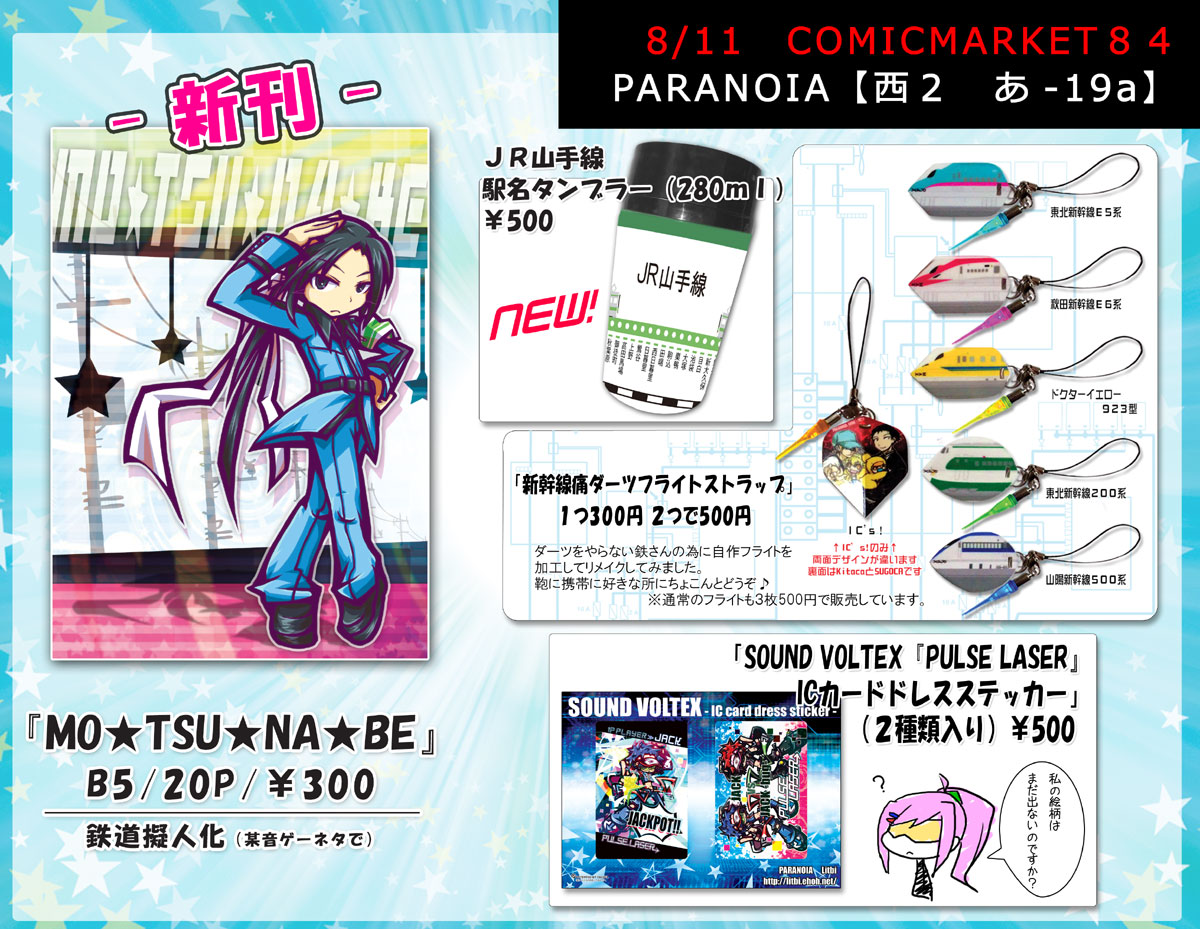 新作グッズ 『JR山手線駅名タンブラー』 280ml、FC 500円 自分が欲しかったので作ってしまった痛ンブラーです(笑) ![]() 「タイトル未定」・・・PARANOIA鉄道擬人化&SDVXジャック&ローズ二次創作 発行日:2013/8/11 夏コミ サークル:糖幻郷 仕様:? 価格:無料配布 うぉおおおおお前回の大井町&ジャックの続きらしいぞぉおおお!!! ローズさん出るってよぉおおおおお!!!! 「2013、7月23日の出来事」・・・PARANOIA鉄道擬人化1.5次創作 発行日:2013/8/11 夏コミ サークル:そこで乗り換えです。 仕様:A5サイズ・コピー 30P 価格:300円 始章 多摩川→池上 中章 目黒×池上 終章 田園都市×世田谷 「乙女たちの休日」・・・PARANOIA鉄道擬人化二次創作 発行日:2012/5/4 スパコミ サークル:sprechchor -シュプレヒコール- 仕様:A5サイズ・表紙FCオフ 34P 価格:300円 東京メトロ女子ズ(南北・丸ノ内・千代田・半蔵門・日比谷)中心。 「V.C.M.」 価格:1000円 1.Fading to the night -intro- +