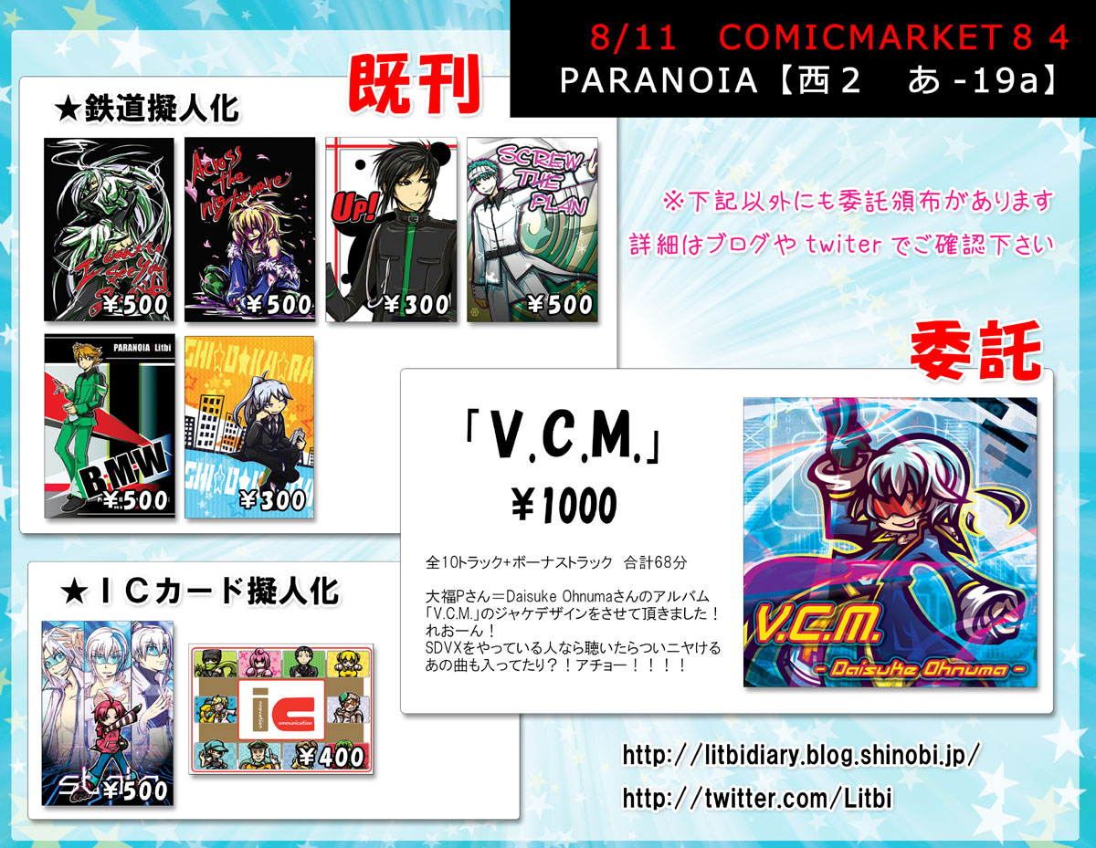 翻訳機能を使ってですが、お礼的なものをば…。 여기 최근, 사이트나 트위터의 메시지에 한국쪽으로부터의 액세스나 코멘트 등을 받을 수 있으므로, 번역 기능을 사용해서입니다만, 답례의 문장을 …. 일러스트나 코멘트등, 감사합니다! 번역 기능을 사용해서입니다만, 확실히 모두 읽고 있습니다! 나에게! 일러스트를! 그리는 기회를 주십시오!! !! 【한국의 음악 시뮬레이션 게임을 제작하고 있는 여러분에게. 】 언제든지 의뢰, 발주 기다리고 있습니다!! ヽ(*´▽`*)ノ https://twitter.com/Litbi/status/332166443997229056 【샘플】 https://twitter.com/Litbi/status/332168986353618944 음악 시뮬레이션에 한하지 않고, 일러스트 작화의 작업 의뢰를 언제든지 기다리고 있습니다 ♪ 부담없이 상담해 주십시오. ニコニコ超会議・M3・スパコミお疲れ様でした今更ながらですが、ちゃんとした名刺を発注しました。 なんかカットが悪くて左側の黒縁が細いのが気になるんだけど…(トンボはしっかりしてたのにな;) 急遽M3にもお手伝いで参加する事になり、今年のGWは3つのイベントに参加してきました! 簡易ながらまとめてレポってみます。 スパコミのお知らせICカード擬人化&鉄道擬人化 スペース 東6 み-48ab 基本的にスペースにいるかと思いますが、もしいない場合は狩り中とお考え下さい。 スケブは受け付けていますが、かなりの遅筆なので早めに来て頂けると助かります。 購入物無くても全然構わないので、お気軽に尋ねてやって下さいませ。 今回のスパコミ、4日は一般で周る予定です♪ ■委託情報 ウチの鉄道擬人化1.5次をやって下さってる神楽さんの新刊と、 その前編である1冊の、合計2種を委託で置かせて頂きます。 「作ってみました」・・・PARANOIA鉄道擬人化1.5次創作 発行日:2013/5/3 スパコミ サークル:そこで乗り換えです。 仕様:A5サイズ・コピー 30P 価格:250円 東急田園都市線×東急世田谷線 >コーヒーゼリーが好きだという田園都市の為に世田谷が、池上や小田急小田 原のアドバイスを受けてコーヒーゼリーを作ってみました。 東急目黒線×東急池上線 >世田谷が欲しがったコーヒーゼリーのレシピを探しているうちに、色々懐かしくなる池上。で、久しぶりに作ってみました。 「好きなんだけど…」・・・PARANOIA鉄道擬人化1.5次創作 発行日:2013/3/17 春コミ サークル:そこで乗り換えです。 仕様:A5サイズ・コピー 30P 価格:250円 神楽さんのスペースも参加されていますので、む-13a 「そこで乗り換えです。」に皆、ダッシュだー!! ニコニコ超会議2 ニコつく3のお知らせICカード擬人化&鉄道擬人化 スペース A-39~42 合計4スペース ★ お絵描きワークショップやるよ! ★ デジタル作画の風景を公開します。 別ディスプレイにて作画画面が表示されるようにします。良かったらゆっくり観ていってね! ネット環境とPCの状態が良ければニコニコ生放送配信もやるつもりです。 何描くかは全然決めてない。 多分、いつもどおり落書きレベルかと思いますが…。 ■委託情報 「V.C.M.」 価格:1000円 1.Fading to the night -intro- + Daisuke Ohnumaさんの新譜ジャケットイラスト、およびデザイン提供Daisuke Ohnumaさん(大福さん)の新譜ジャケットイラストを描かせて頂きました!