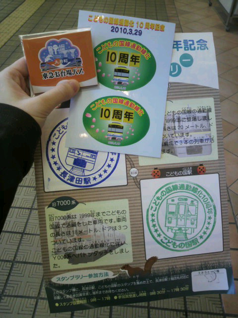 原色青のダウンジャケットでもこもこ付きのフードなやつのつもり。 数日分の電波を垂れ流しちょっと長いけど一気にズラズラいくよ! こどもの国線スタンプラリー「こどもの国線通勤線化10周年記念イベント」でスタンプラリーがあると知ったので行ってきました。 スタンプラリー・・・。 ラリー・・・? ラリれる程駅あったっけ?(笑) スタンプ&ゴールは長津田の田園都市線券売機の所に1つ、こどもの国駅改札出てすぐそこで1つで制覇でした。 3駅しかないにも関わらず、恩田駅総無視!(笑) せっかくだから3駅全部置けば良かったのにねー。 っていうかチルー!!コート紙はやめてぇええ!インク乾かなくて擦れちゃった…。 なんかもう・・・スタンプ用インクがやる気満々であった。 今回初めてこどもの国駅の改札外を出ましたが、思ってたよりも拓けてる場所でした。 そして駅とか目の前のコンビニとか入ってネタになりそうなのを探してみる。 まさかの!っていうモノに2つ気付きましたが、これはいつか本の中で一発ネタとして出してみよう。 え、チル・・・もしかしてみなと&IC'sをあまり好んでいない事が分かった。いや、面倒くさいのか? なんでもっと早くこどもの国駅降りて近辺探索しなかったんだろうと思った。 さてゴールです。 くじを引いたけどハズレでした。景品は東急大井町線あぶらとり紙。 マチ自重せよ…!(笑) アタリだと何だったんだろう?他の景品が見えなかったので分かりません。 そのまままっすぐ帰るのもアレだし・・・とドコモショップへ。 携帯購入当初から電池の減りが異常なので、ちょっと見てもらった。 そしたらなんか充電器差す所がちょっとグラついていたらしい。 なので修理に出してきました。帰ってくるのは3週間後くらいとの事。 戻ってくるまで代換機を使用するのですが、運良く全く同じ機種があったのでそれを借りる。 うん、やっぱり元のウチの携帯と比べると電池具合が正常だ。 鉄道居酒屋キハ!今までずっと気になってたキハに行ってきました。えぇ、1人でです。 だって平日だし、行くと決めたのは会社出る20分前くらいで突然だったから、誰か誘おうにも急過ぎて申し訳ないから誘えなかったの・・・。 人形町駅から店まで迷わず行けるくらいの簡単な道のりでした。 いやーはっはっは、やっぱり初めてのお店に初めて1人入店ってのは何度やってもドキドキですね! とりあえず一番辛い日本酒とおつまみを貰いました。 後はもうその場の雰囲気に流され、成るように成り染まれ、です。これ、1人呑みの基本。 金曜日は常連さんが多いらしく、また週末だから結構混雑してました。 1階で色々盛り上がって、2階に誘われたので行ってみた。 盛り上がり具合度が1階と違う(笑) 中には女性の方(同じく初だったらしい)もいらっしゃったので、飲みつつ絡みつつ笑ってきました。 いやはや、この日一番ビビったのが、鉄道擬人化つったらこの人!っていう位有名な恵知仁さんがいたっつー事だよ。 酒の勢いもあってか、お互い絡み絡まれ・・・なんやかんやで皆で爆笑しつつ楽しい時間を過ごしました。 皆さんこんな奴と会話して下さってありがとうございましたー!!(2杯目のカップ酒片手に) 個人用と法人用のEX-ICとかも見せてもらったよ! 結局小田急終電で帰る事になりました(笑) 店から最寄の駅まで猛ダッシュしたぜ!結構な距離あったから、スタミナ無い自分はすぐゼェハァした・・・。 でもなんとか無事に部屋まで帰ってこれた。 そういえば缶詰バーを銘打ってるお店なのに、結局1缶も缶詰注文せずにクリームチーズの揚げ物を頼んでた。 しかしこれが最高に美味かったのである。 塩といい感じに味が絡まってさ・・・、日本酒に合うわ合うわ。 これから行く時は品切れて無い限りこれは絶対頼もうと思う! なかなか凝ってる(笑) 記念に助役さんと! 28日の川口の同人イベント「COMICぷらねっと」に当日参加する事を今日決めた。 こんな感じで以前のように今後も突発的に参加してのんびりしたいと思います。 ニコ生放送終了本日2度程やっておりました。 春コミお疲れ様っしたー!結局徹夜参加で会場にてBさんと合流して入る。 イベント中はまったりというか堕落していました。眠気もあって・・・。