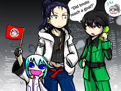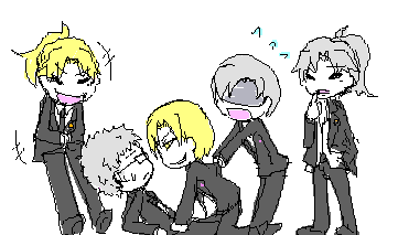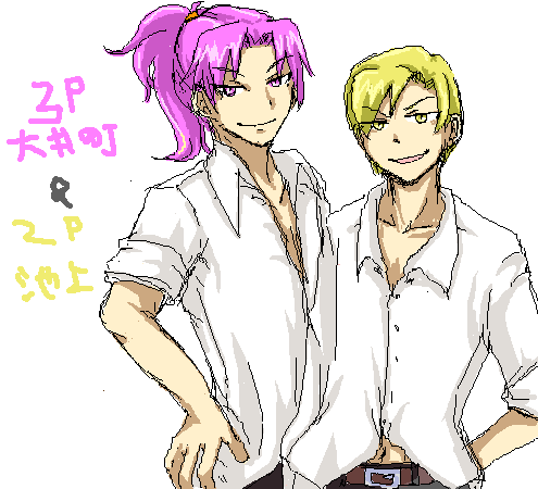 格ゲーやポップンみたいな裏色の事ですね。 2Pどころか3Pや4Pもキャラによっては出来ています。なんだこれ楽しいぞ! 今の所まだ一部の東急キャラしか作ってません。 一番良い感じに出来たのが2P池上でした。フィーバーしてた。 ぼうさんに描いてもらった2P池上×世田谷、トシ×2P池上、トシ×ノーマル池上に燃えた。萌えた。 でもトシを2Pにしてみたら、ノーマルとは完全真逆の性格になりましたけどね。 あ、池上もそうか。 後程ブログの方に8月の絵チャログをまとめて載っけようと思いますー。 あ、あとPixiv。 ずっと名前だけ登録しててサッパリ手を付けてなかったのですが、サイトに載せてる絵をちょっこり置いときました。 今後もまたどんどん増えていくつもり。日記で描いた落書きとかも。 http://www.pixiv.net/member.php?id=1770 2P池上×1P池上 ゲーセンにたむろって格ゲーしてそうな不良共。 マチのピンク頭が似合いすぎて困る。 蝉バロス