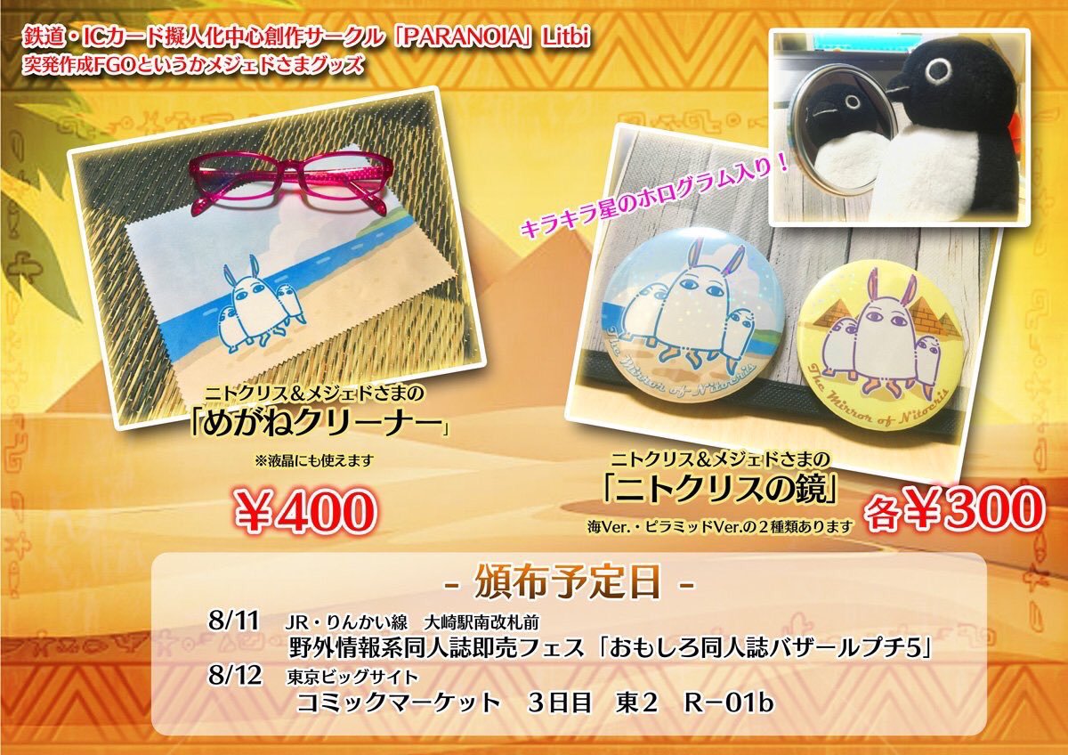 気付けば1年書くのをサボってました色々私生活が忙しくて、何とか同人誌即売会に参加できても、 夏コミC94のお知らせICカード擬人化&鉄道擬人化 スペース 3日目(日) 東2 R-01b 夏コミ前日の、大崎駅前で行われる「おもしろ同人誌バザールプチ5」にも参加します。 新作【FGO+メジェドさま 眼鏡(液晶)クリーナー】¥400